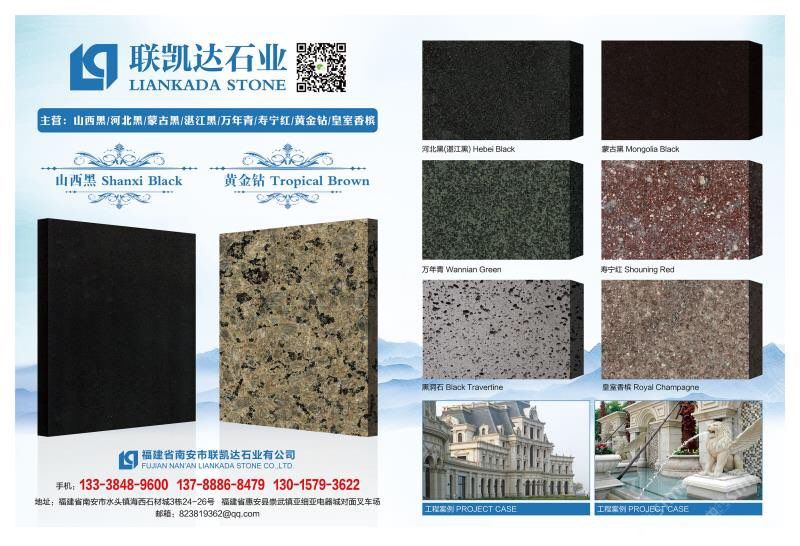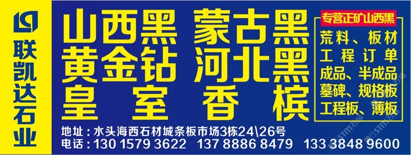 本公司主要經(jīng)營(yíng) 皇室香檳 黃金鉆/金鉆麻 山西黑 河北黑 壽寧紅/雞血紅 國(guó)產(chǎn)皇室啡 荒料 板材 工程訂單 園林景觀訂單 碑石半成品 成品