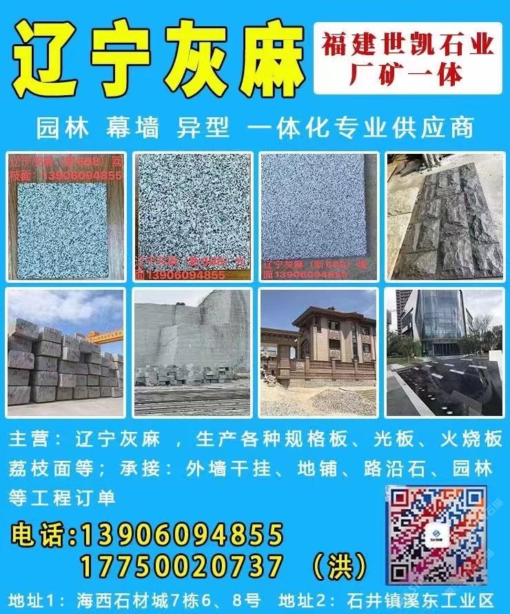 主營石種:遼寧灰麻(新688) 、 芝麻黑(新G654) ,長期儲存5000~10000立方荒料,滿足各大石材工程需求。從荒料開采到成品呈現(xiàn),產(chǎn)品涉及園林、幕墻、異型等各類工程訂單,廠礦一體,公司下設(shè)荒料堆場部,市場營銷部,工廠配備專業(yè)生產(chǎn)先進機械設(shè)備。25年來專注于各種天然石材加工、成品、銷售?,F(xiàn)已成為專業(yè)國內(nèi)外石材供應(yīng)商,本著“誠信為本,合作共贏”經(jīng)營理念,為廣大客戶提供生產(chǎn)配套以及大型施工安裝一條龍服務(wù)!