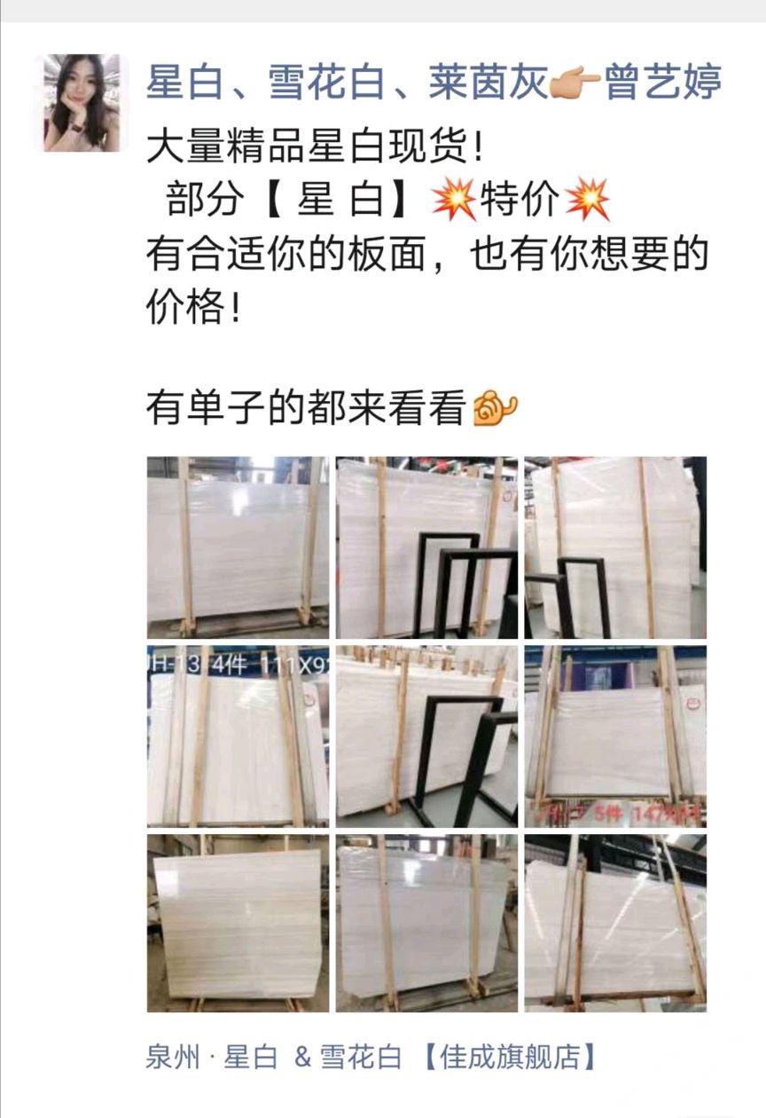 發(fā)布信息: 部分星白特價,有單子的詳談! 厚度: 1.5cm & 1.8cm 地址 : 南翼石材城三號四號倉三區(qū) 【佳成石業(yè)】 財富熱線:13489368683曾
