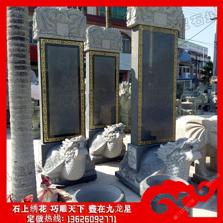 發(fā)布信息: 石雕龜馱碑?dāng)[件 龍龜馱碑圖片價(jià)格_九龍星石業(yè)。 石雕龜馱碑?dāng)[件又稱龜載碑、龍龜碑、烏龜碑、龜陀碑等。而確切的說(shuō),它應(yīng)該叫赑屃,傳說(shuō)中它是龍生九子之一,力大無(wú)窮而且性格好,又善背重東西。龍龜馱碑多用于寺廟和立碑紀(jì)念,因?yàn)辇敒殚L(zhǎng)壽的動(dòng)物,古人以此建碑,也是想保存千秋萬(wàn)載,讓碑流芳萬(wàn)古的寄托。 石雕龜馱碑又名霸下,形似龜,傳說(shuō)為龍九子之一.是老六,螭頭龜足,平生好負(fù)重,力大無(wú)窮,碑座下的龜趺是其遺像。傳說(shuō)霸下上古時(shí)代常馱著三山五岳,在江河湖海里興風(fēng)作浪。后來(lái)大禹治水時(shí)收服了它,并為治水作出了貢獻(xiàn),洪水治服了,大禹?yè)?dān)心它又到處撒野,便搬來(lái)頂天立地的特大石碑,上面刻上霸下治水的功跡,叫它馱著,沉重的石碑壓得它不能隨便行走。