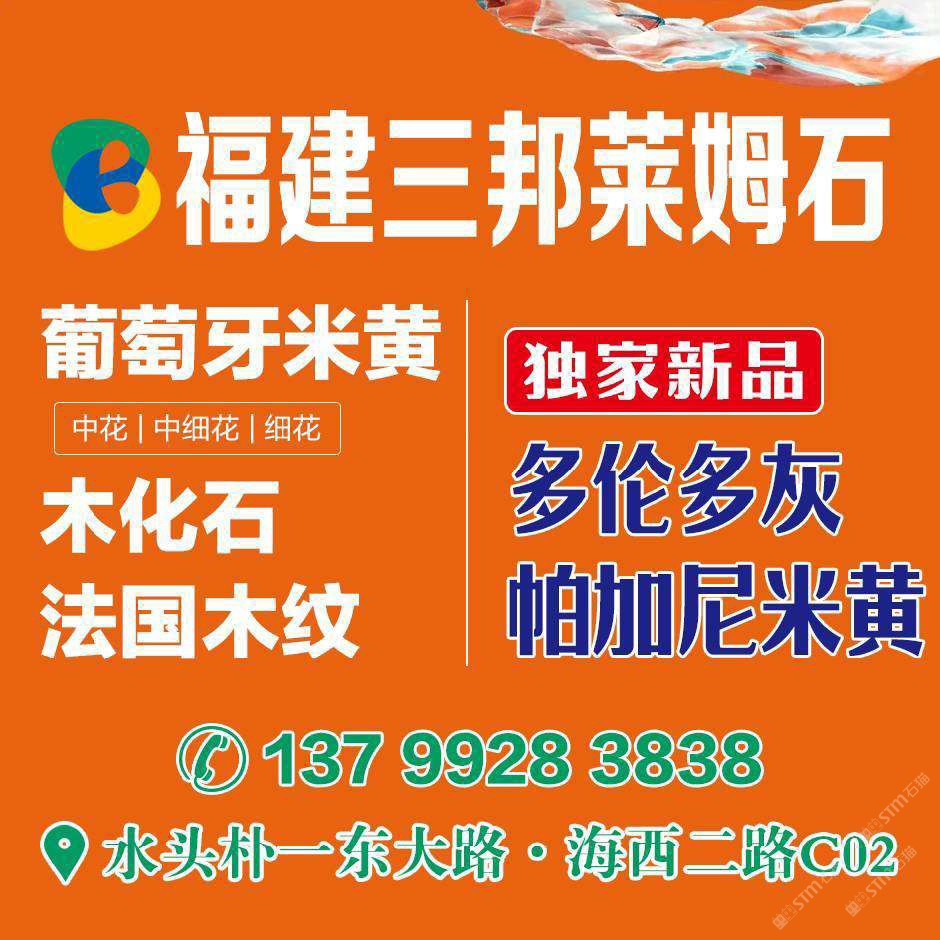 福建三邦石業(yè) 聯(lián)系人:高先生    137****5858 查看 手機號碼:無 主營范圍: 大板批發(fā)、異型加工、礦山、石材雕刻、石材工藝品、石材工程資質(zhì)企業(yè)、石材交易市場、水刀拼花、 企業(yè)地址:福建泉州樸一工業(yè)區(qū)東大路(直走200米)